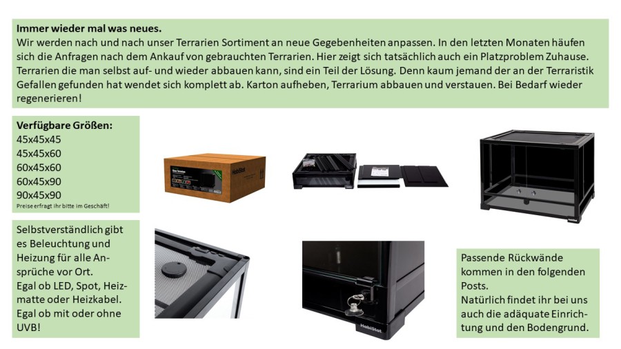 Wir helfen euch wenn es mal klemmt. Gerne richten wir mit euch zusammen ein Terrarium für euer Wunschtier ein. Hier für eine kleine baumbewohnende Spinne. Die Terrarien werden iimmer individuell für euer Wunschtier angepasst. Größe, Elektrik und Einrichtung variieren also immer. Deshalb hier keine Preise oder Größenangaben. Außer den Standardmaßen können wir auch Terrarien in vorgegebenen Größen. Fragt einfach nach!